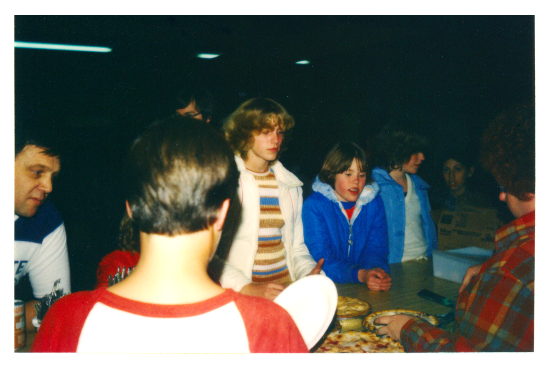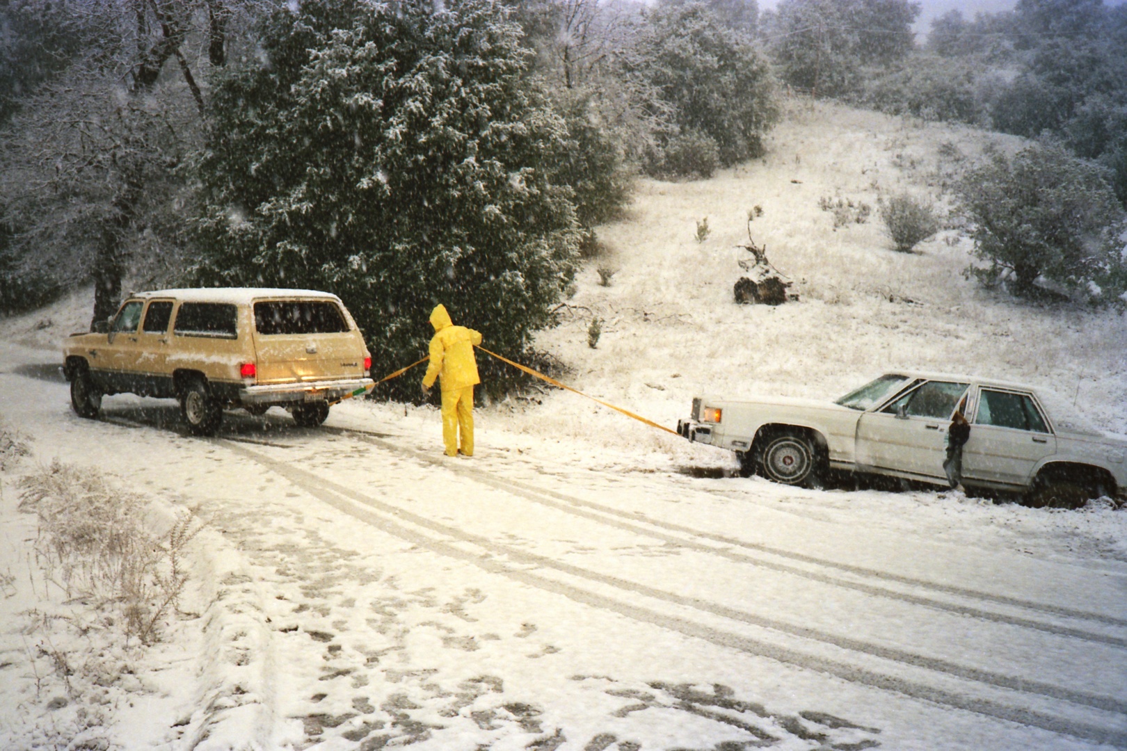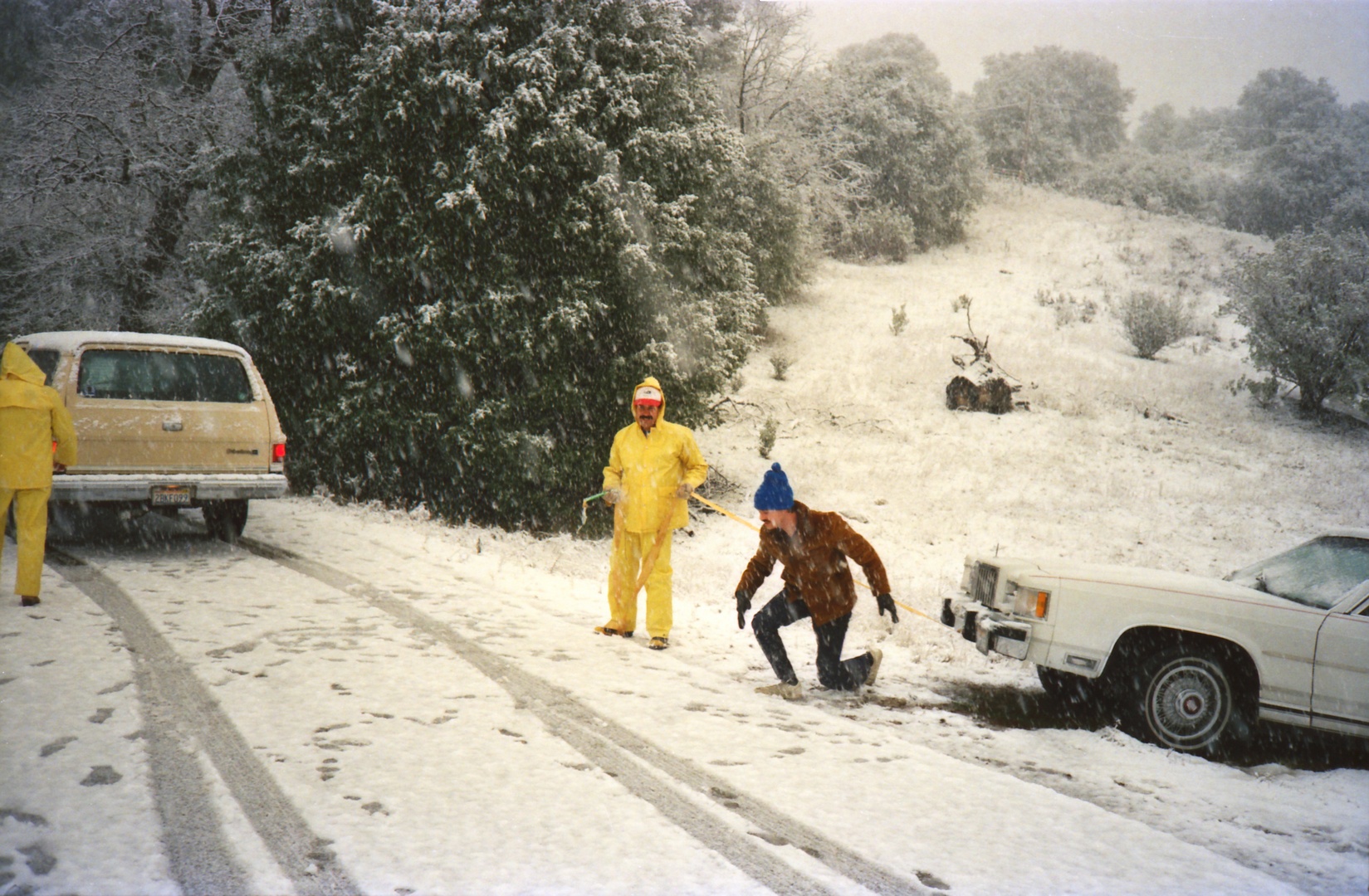 Bruce Pickard (center) and Dick Parrish (far left) help Craig extract his family’s 1985 Mercury from a snowbank.