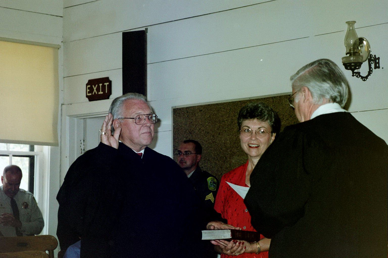 Judge Parrish takes the oath of office while Elaine holds the Bible (Aug 16, 2002)